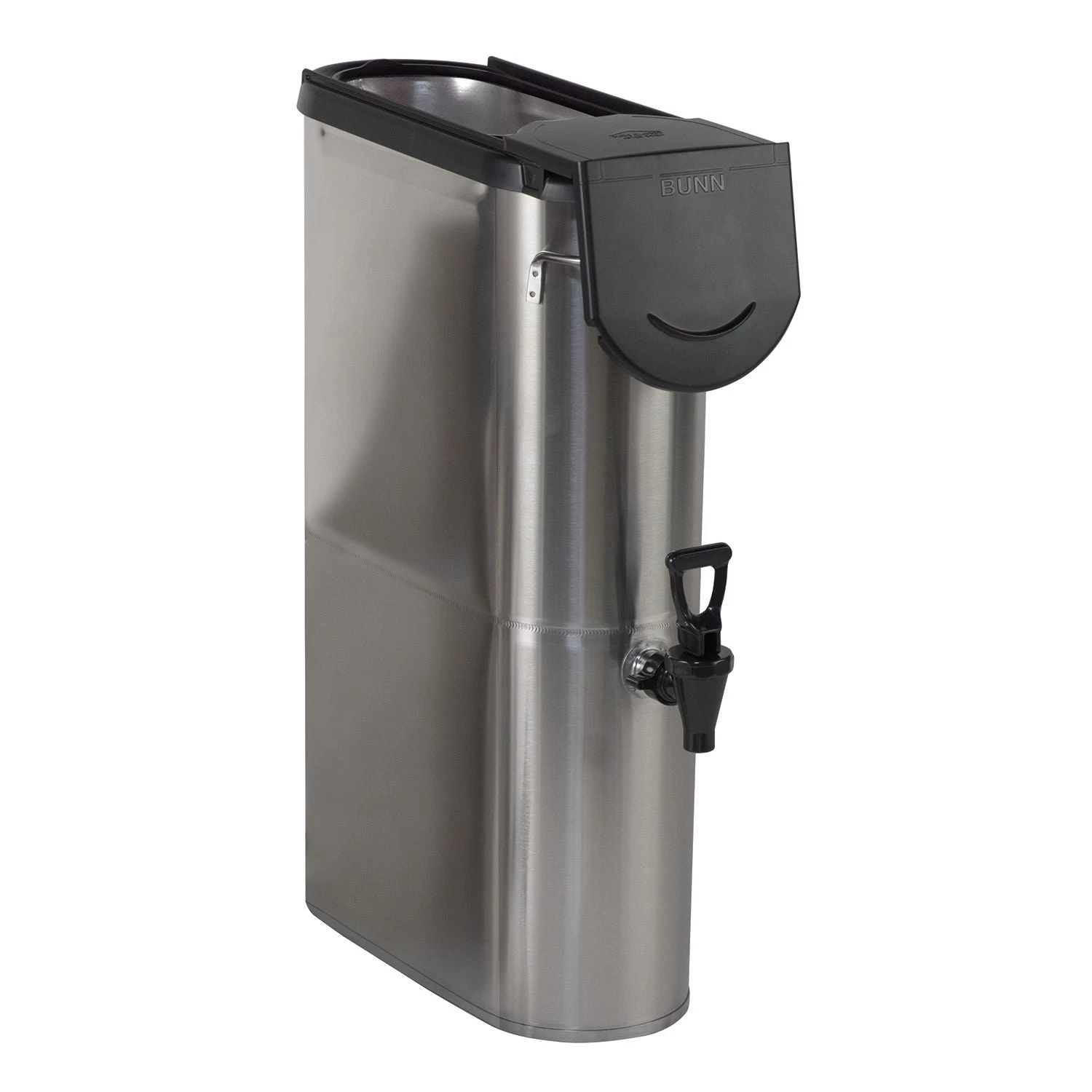 This oval style narrow space-saving iced tea dispenser is designed to hold and serve a 3.5 gallon batch of iced tea or iced coffee. Brew thru lid design is great for reducing the spread of germs and less chance of misplacing or breaking the lid.